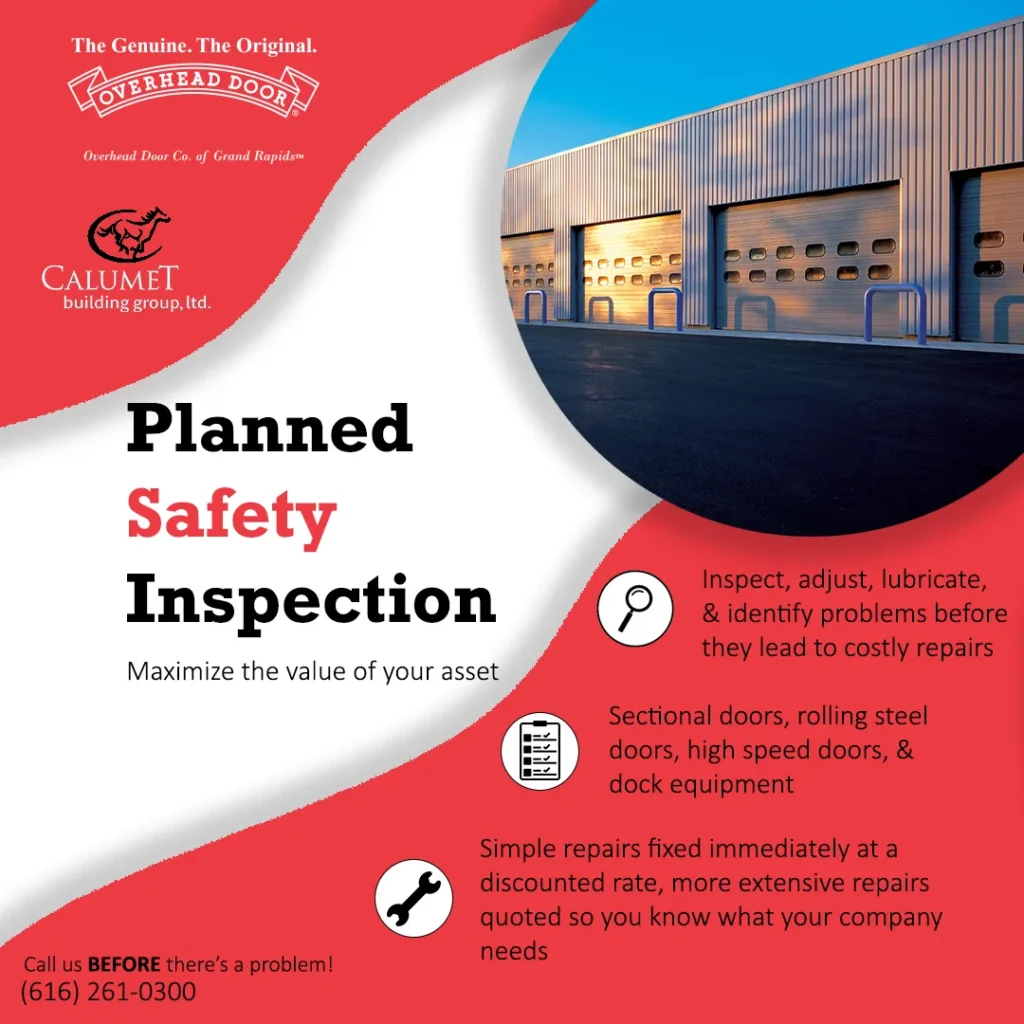 Overhead Door Co. of Grand Rapids offers Planned Safety Inspections for sectional, rolling steel, and high speed doors. We also offer Planned Safety Inspections on dock equipment under our sister company Calumet Building Group.