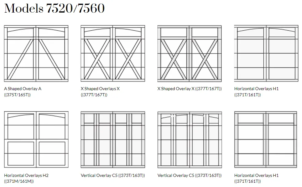 The Courtyard Collection® garage doors are available in nine standard colors or can be painted to match your home’s décor. Color selections may not be available for some models. Door overlays and window trim are available in the colors shown or can be painted to match your home’s décor (additional charges may apply.) The 7560 (160) series garage doors can be painted solid or two-tone. The 7520 (370) series in only available with white trim.